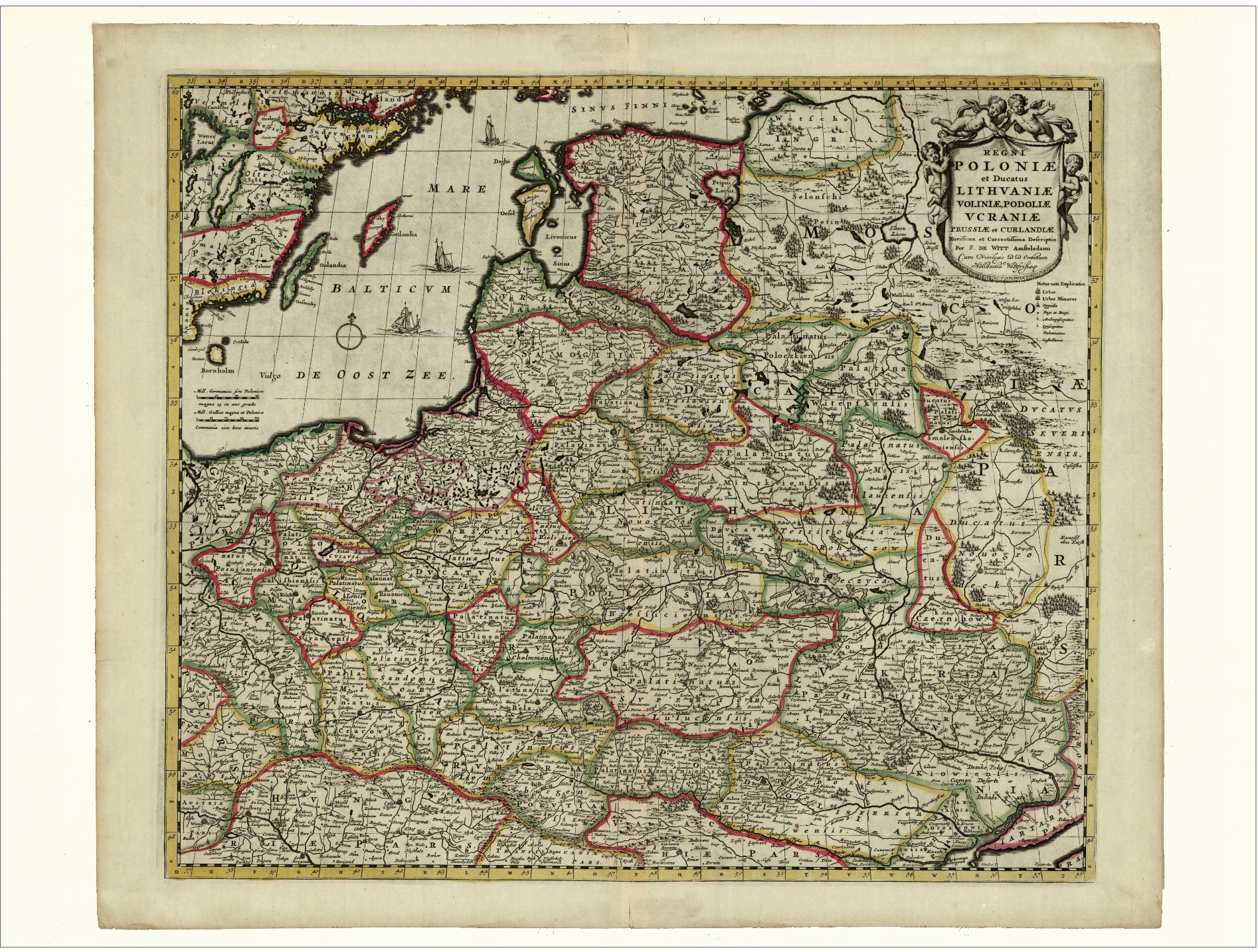 mapa obejmuje tereny: Polska, Litwa, Wołyń, Podole, Ukraina, Prusy, Inflanty