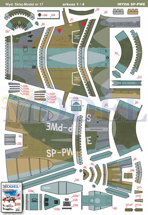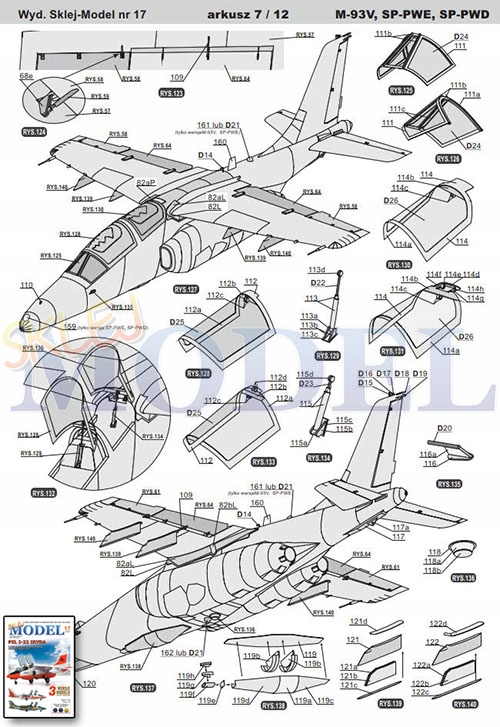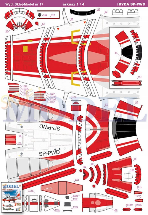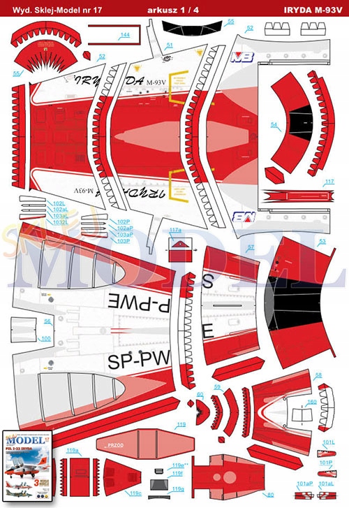 Model zawiera trzy warianty kolorystyczne najbardziej charakterystycznych malowań tego samolotu – kamuflażowe z pokazów w Poznaniu w 1996r. (SP-PWE, w tym przypadku jeszcze jest alternatywa w postaci zastosowania części poszycia z szachownicą i bez) oraz dwa białoczerwone (wersja SP-PWD z silnikami K-15 i bocznym napisem IRYDA na silnikach oraz wersja M-93V z silnikami Rolls-Royce).