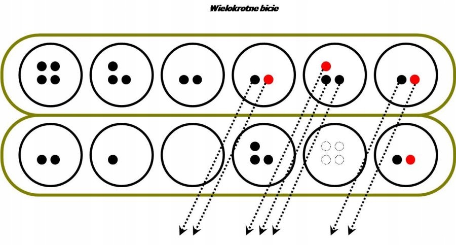 Если последний камень приземляется на поле, давая захват (избиение) и предыдущий в порядке поля также они содержат два или три камня (в любой комбинации) - эти камни также взятие (многократное избиение).