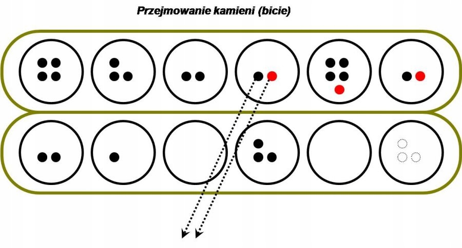 Если после движения (захвата камней) у противоположного игрока нет ни одного камень играть на своей территории-такой ход запрещен и играть надо иначе, да чтобы на территории противника оставались камни. Если такой ход невозможен, игрок у который находит все остальные камни на доске добавляет их к вашим захваченным камням и игра заканчивается.