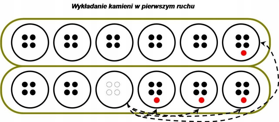 Перед началом игры игроки выбирают тот, который начнется. В последующих игра начинается с победы. Игроки делают свои ходы по очереди. На первом ходу игрок он собирает все камни с одного (любого) поля на своей территории (6 полей ближе всего к игроку). Затем он выстраивает их (разбрасывает) по одному в каждое из следующих полей, двигаясь противоположно по часовой стрелке. Первый камень приземляется в первом поле справа, а другой - в каждом следующим.