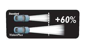 Żarówki Philips Vision Plus sprawiają, że samochód emituje światło na odległość dłuższą o 25 m niż w przypadku żarówki standardowej. Nasze rozwiązania oświetleniowe generują potężną i precyzyjną wiązkę światła o maksymalnej mocy. Oferujemy wyłącznie najlepsze i najwydajniejsze rozwiązania oświetleniowe, ponieważ wiemy, że nasze oświetlenie o wysokiej jakości może pewnego dnia ocalić komuś życie na drodze.