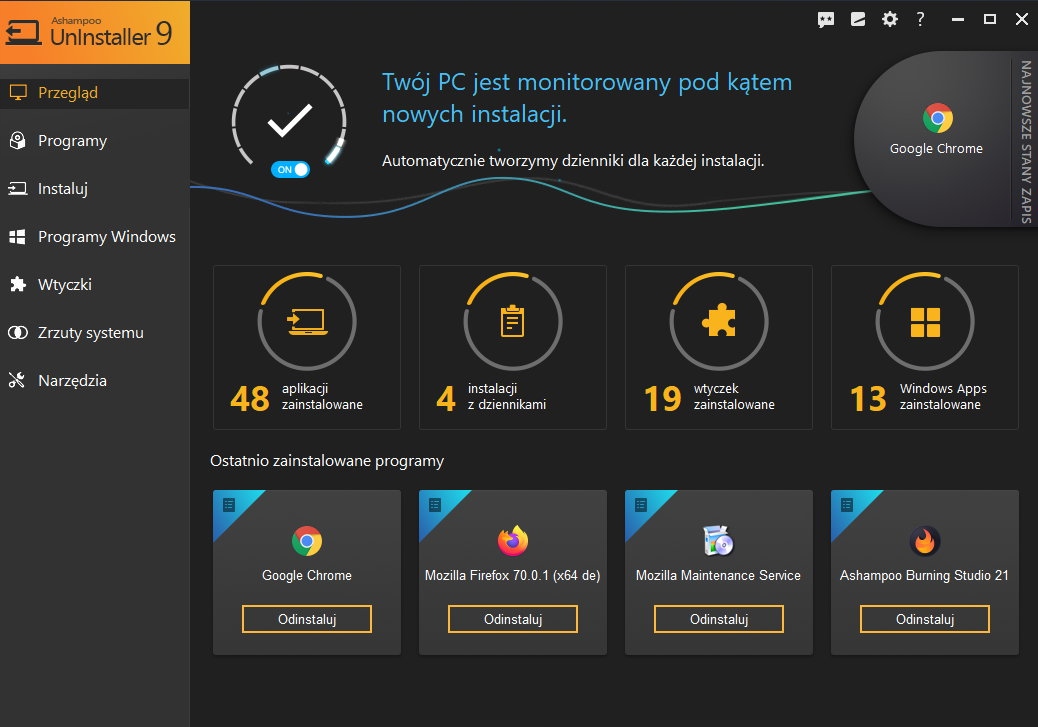 Poznaj następną generację naszego najlepszego oprogramowania do dezinstalacji! Ashampoo® UnInstaller 9 zawiera wiele nowych funkcji i precyzyjnych usprawnień. Aby usunąć programy, wystarczy teraz przeciągnąć ich skróty na ikonę UnInstaller, a nowy kreator migawki tworzy punkty przywracania przed i po każdej instalacji dla pełnego bezpieczeństwa! Monitorowanie instalacji w tle zostało całkowicie zmienione, aby zapewnić dokładniejsze i bardziej niezawodne śledzenie nawet po rebootach systemu. Ciesz się bezpieczniejszym i czystszym systemem dzięki najbardziej kompletnej wersji Ashampoo® UnInstaller w historii!