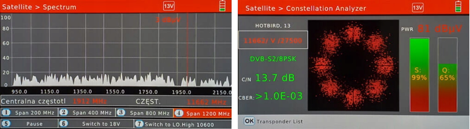 Для оценки сигнала спутниковой системы и анализа ошибок приема используйте анализатор спектры в реальном времени. Спектр изменяется немедленно во время движения сигнала, и график дисплей постоянно обновляется.