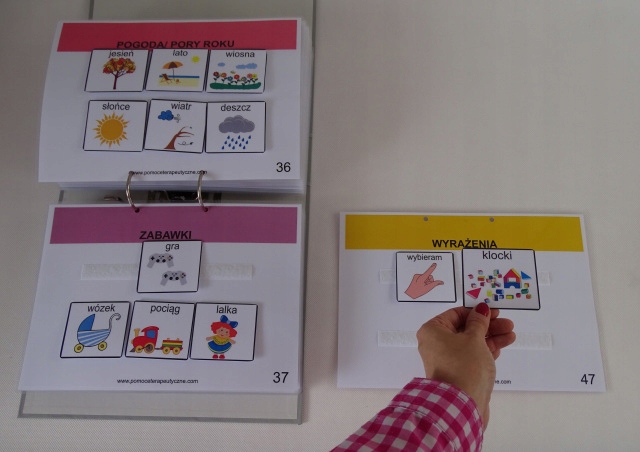 Książki zawierają łącznie 54 zalaminowane karty aktywności (w wersji dwustronnej) - podzielone są na 2 części, mamy możliwość zaczepienia wszystkich obrazków za pomocą np. rzepy samoprzylepnej, którą możecie Państwo zakupić u nas, lub w opcji wszystko z naklejonym rzepem. Wszystkie karty aktywności są podpisane i poukładane kategoriami.