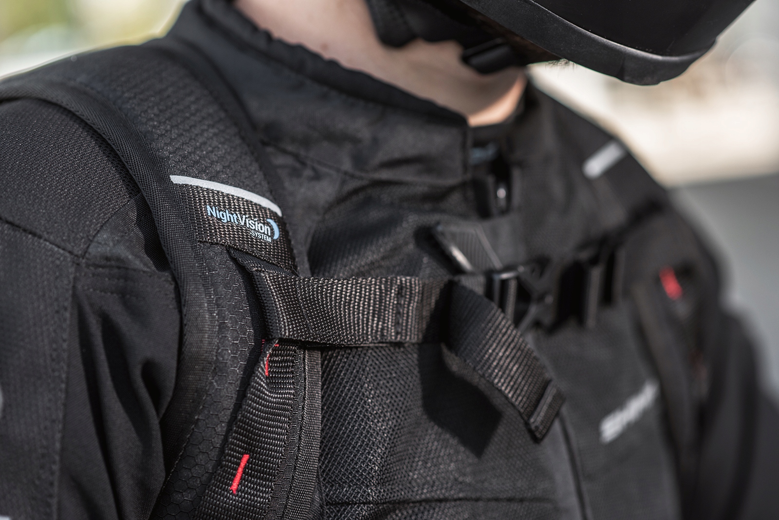 Панели светоотражающие Night Vision размещены таким образом, чтобы мотоциклист был виден на дороге с каждой стороны. защищена от мелкого дождя и влаги, а покрытие снаружи легко очистить с любых загрязнений.