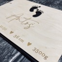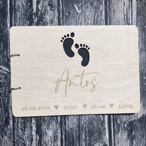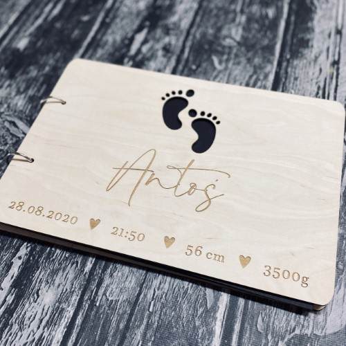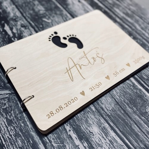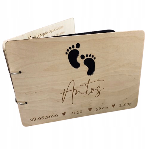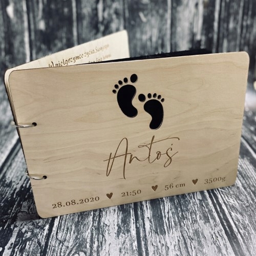Pierwsza strona ozdobiona jest grawerem, a także wycinanymi stópkami. Natomiast ostatnia strona zawiera dedykację oraz podpis. Album jest w kolorze naturalnego drewna, dzięki czemu jest uniwersalny i będzie pasował na każdą okazję. Dodatkowo album można dowolnie ozdabiać i malować. Album jest w formacie A4 i zawiera 25 kartek.