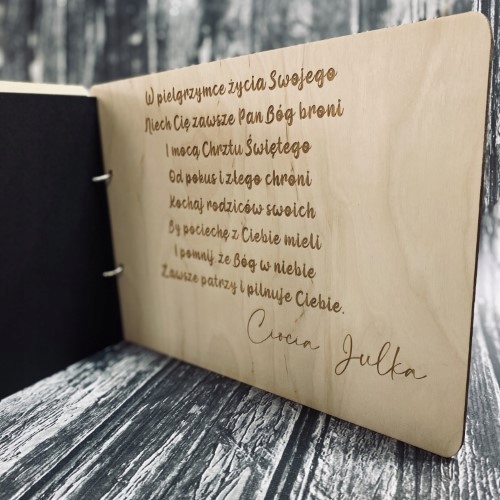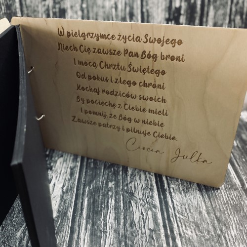 Album na zdjęcia, wykonany ze sklejki 3mm z czarnymi kartkami. Pierwsza i ostatnia strona ozdobione personalizowanym grawerem. Idealny pomysł na prezent.