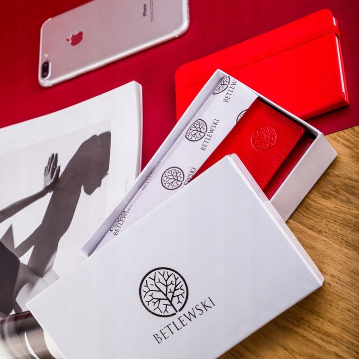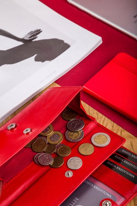 Красный цвет всегда красив и привлекая внимание. Мы использовали его потенциал, объединив его корова высокого качества. Верхняя часть кошелька имеет чрезвычайно тонкий блеск - с таким дополнением вы будете в форме дерева тиснением на передней части кошелька добавляет ему женственный шарм, который оценит любой модница.