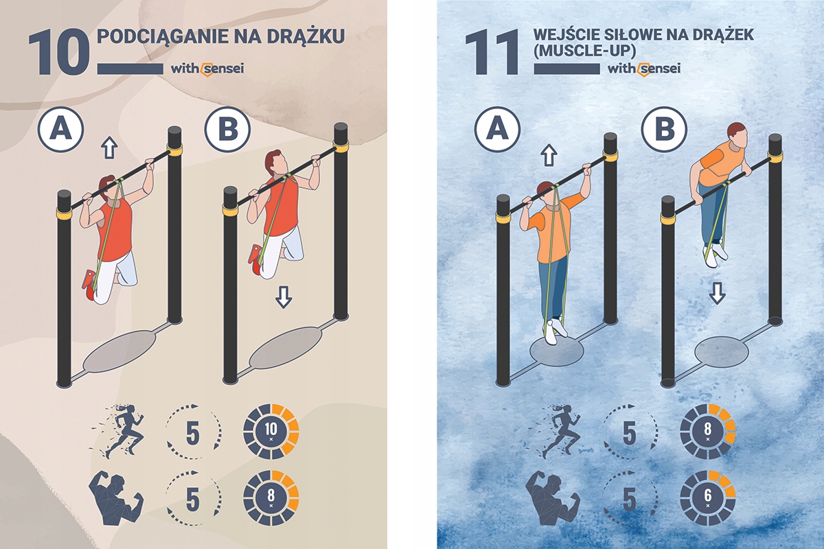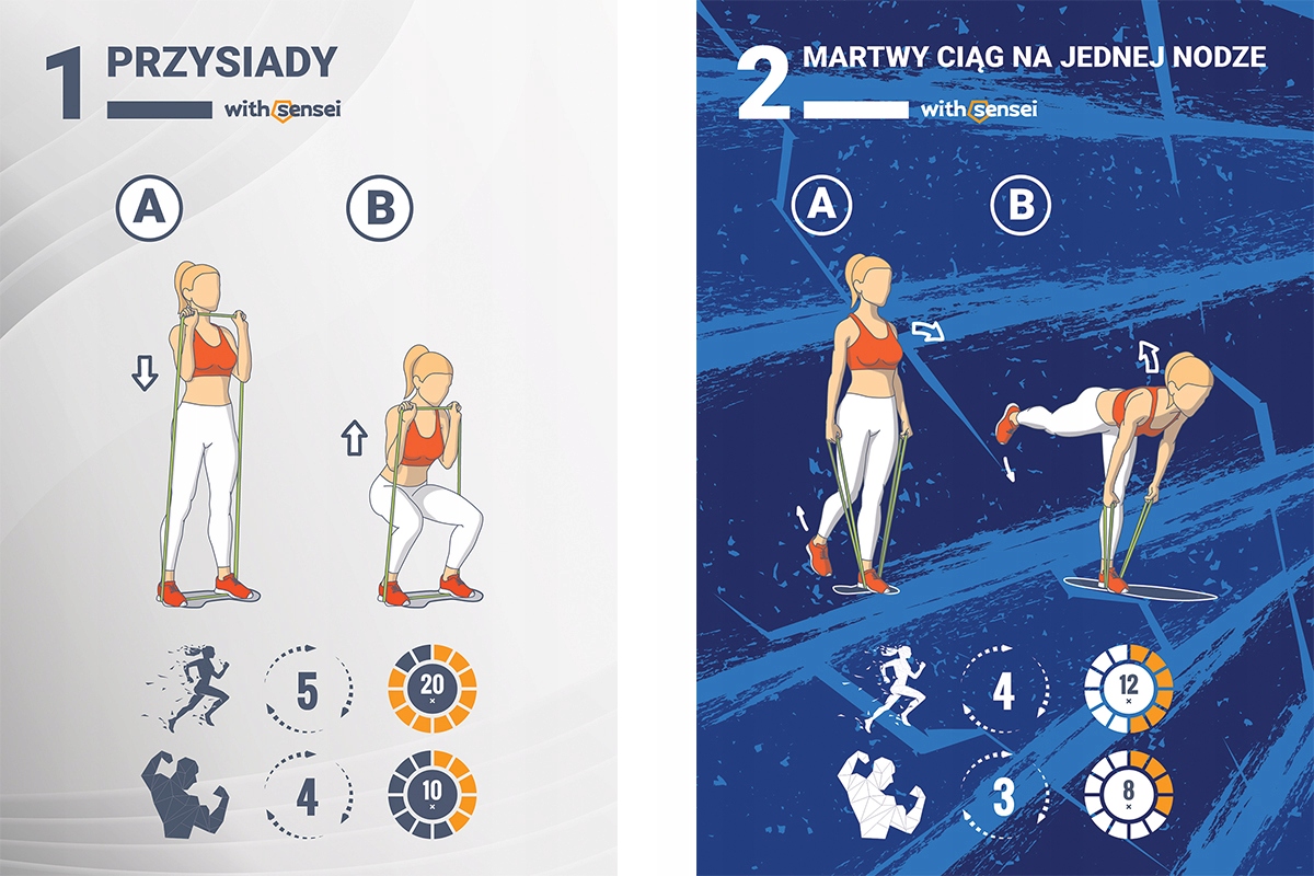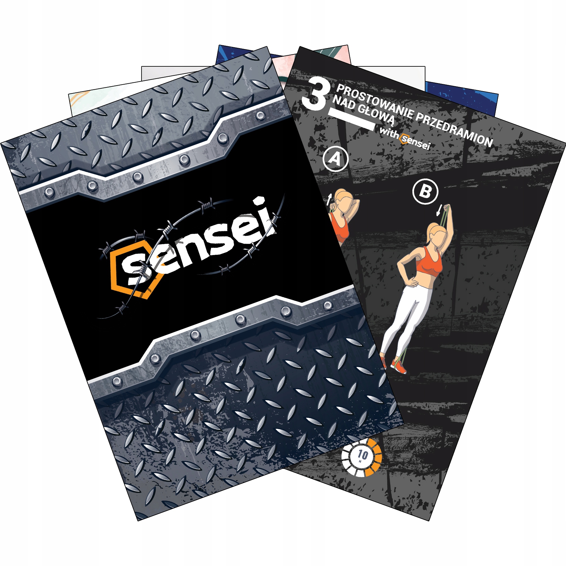 ✒️ Instrukcje zawierają aż 11 ćwiczeń z gumami oporowymi Sensei. Do każdego ćwiczenia znajdziesz dwa warianty treningu: kondycyjny oraz siłowy. Z ilustrowanej instrukcji dowiesz się jak wykonywać poszczególne ćwiczenia, ile serii oraz ile powtórzeń w serii wykonać. A wszystko to zwizualizowane w przystępnej formie przy pomocy rysunków i grafik.