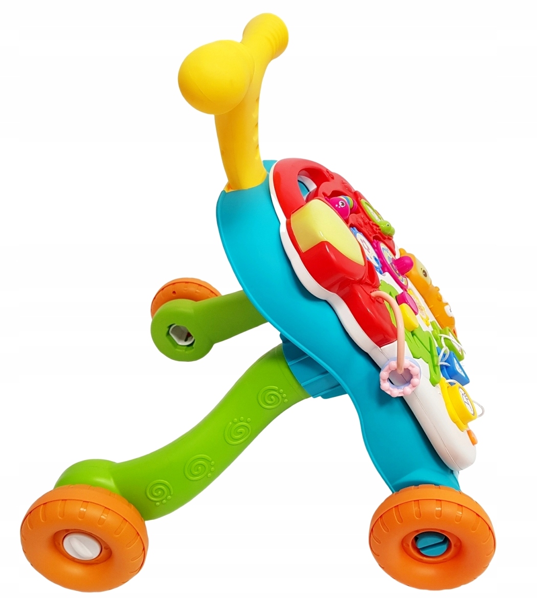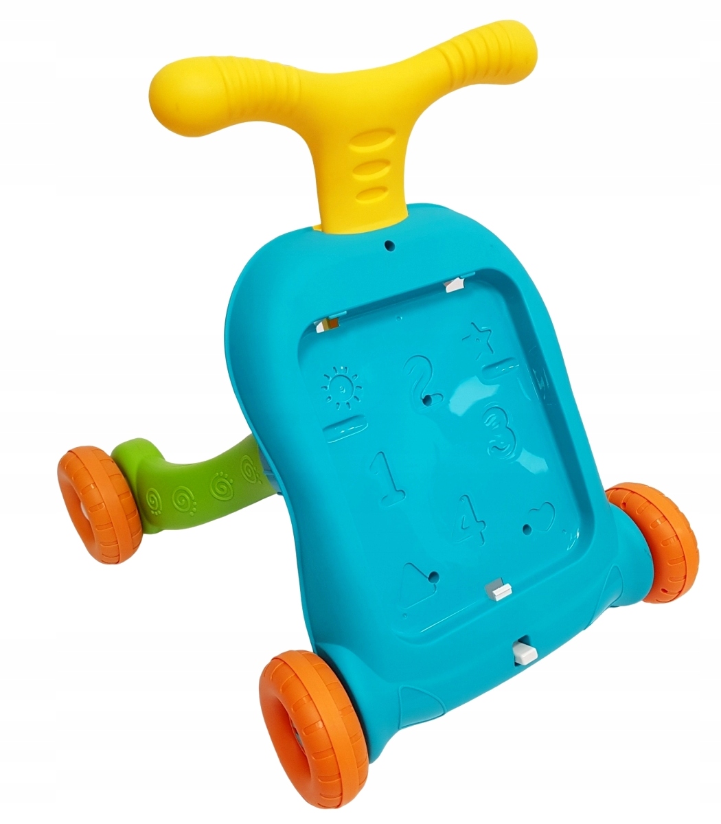Gdy zacznie już próbować samodzielnie chodzić wykorzystamy pchacza. Pomoże on w nauce chodzenia. Pchacz posiada blokadę toczenia w tylnych kółkach. Koła posiadają gumowe nakładki antypoślizgowe, oraz specjalny pojemnik który napełniamy wodą w zależności od wieku i wagi dziecka. Ma to za zadanie większą stabilizację pchacza w okresie gdy dziecko stawia pierwsze kroki a jego ruchy są dość chaotyczne. gdy dziecko zaczyna już poruszać się płynnie pojemnik można odczepić