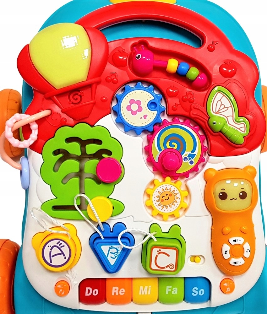 Interaktywny panel jest odpinany. Możemy go wyjąć z pchacza i złożyć stolik lub użyć panela jako samodzielnej zabawki i wykorzystać np w podróży. Specjalne zaczepy umożliwiają przymocowanie panelu w łóżeczku dziecka.