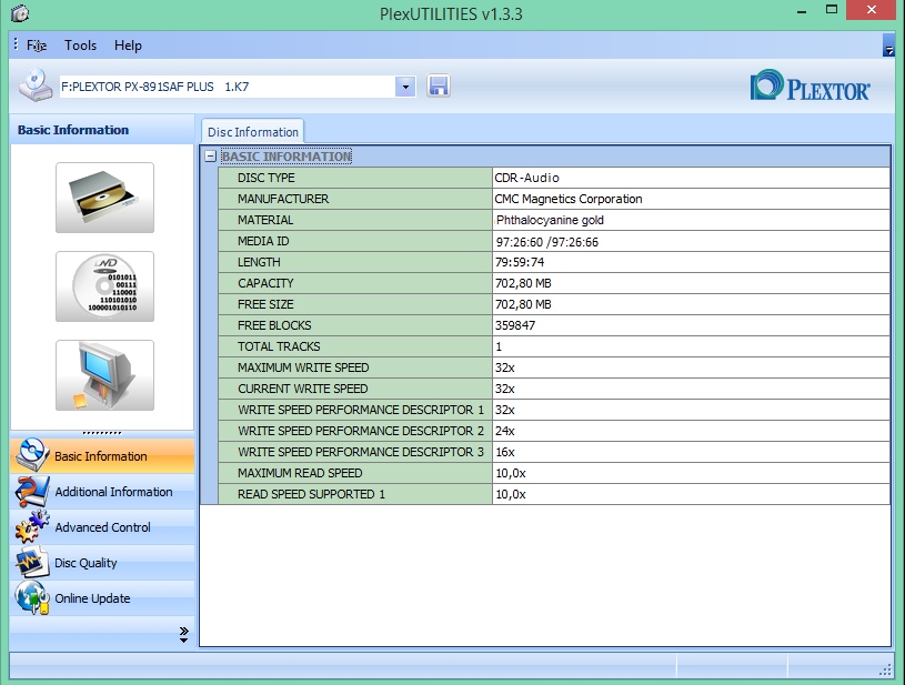 Płyta idealna do zapisu AudioCD na nagrywarkach YamahaPlextor Premium 2 w trybie Audio Master Quality Recording czy i Advanced Audio Master Quality Recording