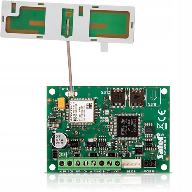 MODUŁ KOMUNIKACYJNY GPRS Satel INT-GSM umożliwia centralom alarmowym serii INTEGRA i INTEGRA Plus komunikację przez sieć GSM. Pracuje na magistrali manipulatorów centrali alarmowej. Obsługuje 2 karty SIM, przez które może jednocześnie odbierać wiadomości i połączenia przychodzące. Wszystkie transmisje GPRS są szyfrowane w standardzie AES-192.