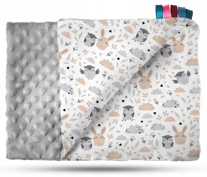 Kocyk jest dwustronny z jednej strony milutki materiał minky, z drugiej bawełna w różnych wzorach.