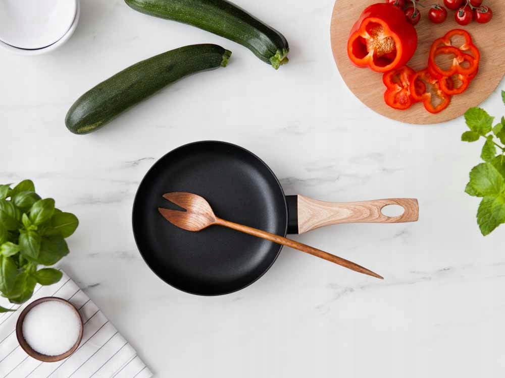 Wśród trendów aranżacji wnętrz w tym sezonie jednym z wiodących nurtów, jest motyw wszechobecnego drewna. Projektanci inspirują się kształtem i strukturą drewnianych słoi czy kory drzew. Motywy imitujące strukturę drewna pojawiają się w dekoracjach porcelany, artykułach z nowoczesnych tworzyw, a nawet na tekstyliach. Uchwyty patelni z linii Natura, delikatne w dotyku przypominają strukturę drzew. Odpowiednio wyprofilowane, ograniczają nagrzewanie, chroniąc dłonie przed oparzeniem. Korpus naczyń wykonany został z aluminium. Aluminium to najlepszy przewodnik ciepła. Dzięki temu mamy pewność, że każde z naczyń bardzo szybko się nagrzeje i długo utrzyma ciepło. To oszczędność czasu, energii a w efekcie naszych pieniędzy.