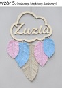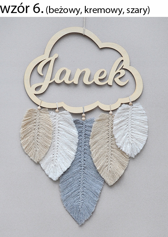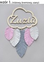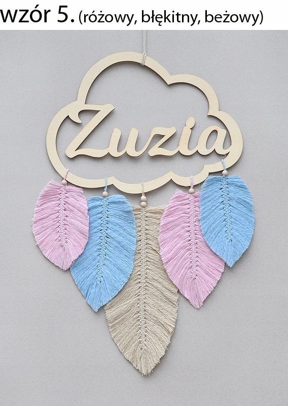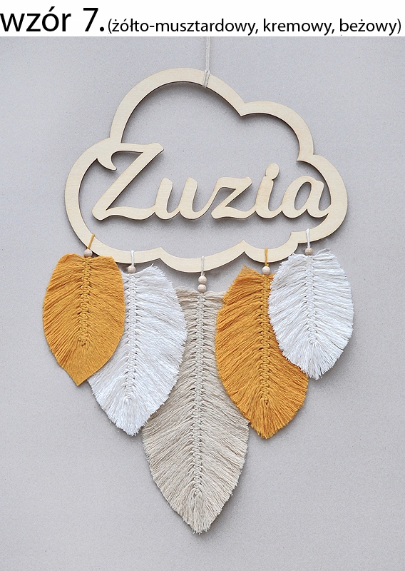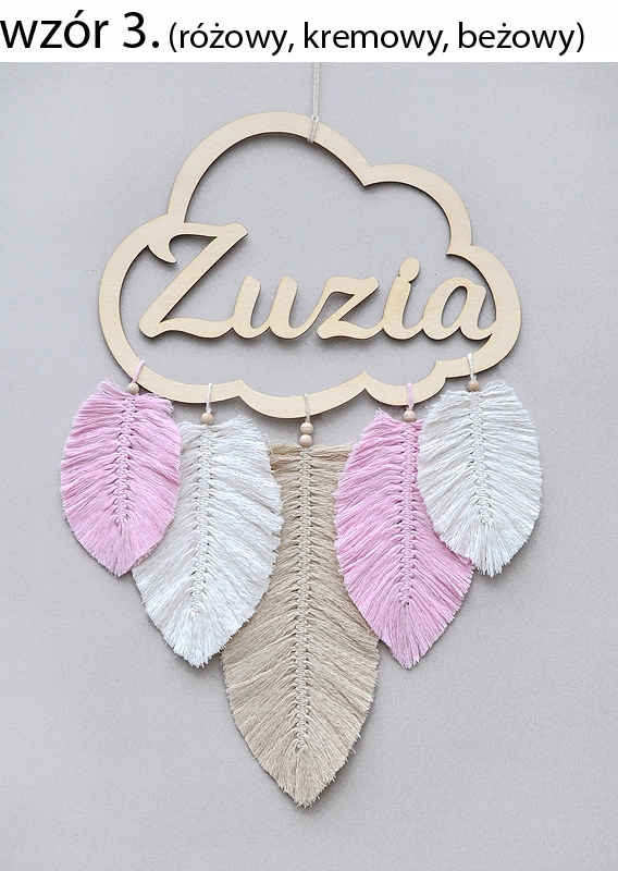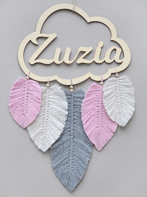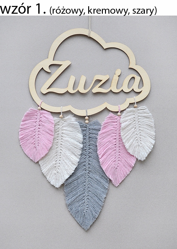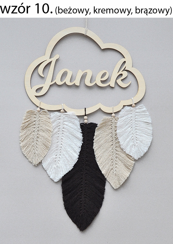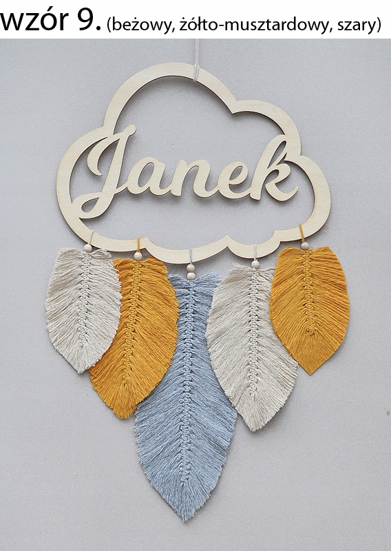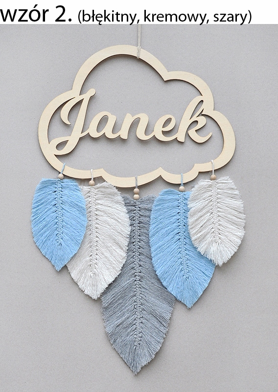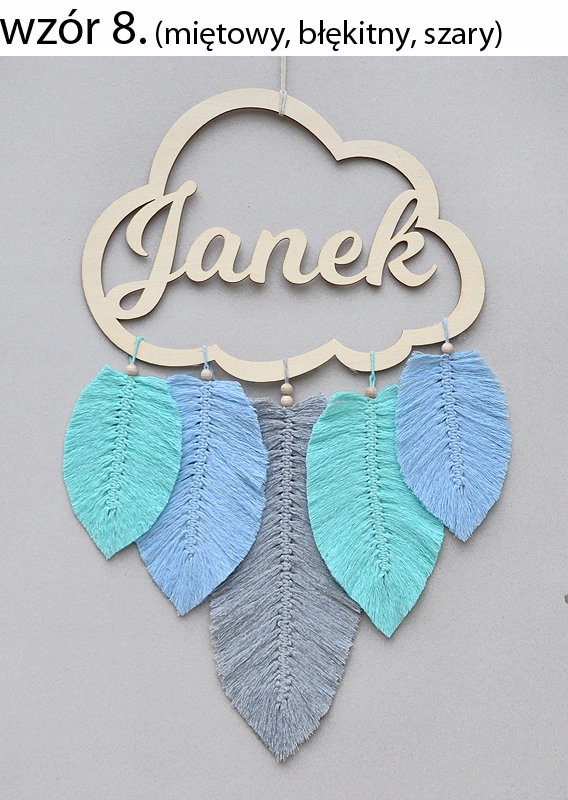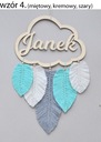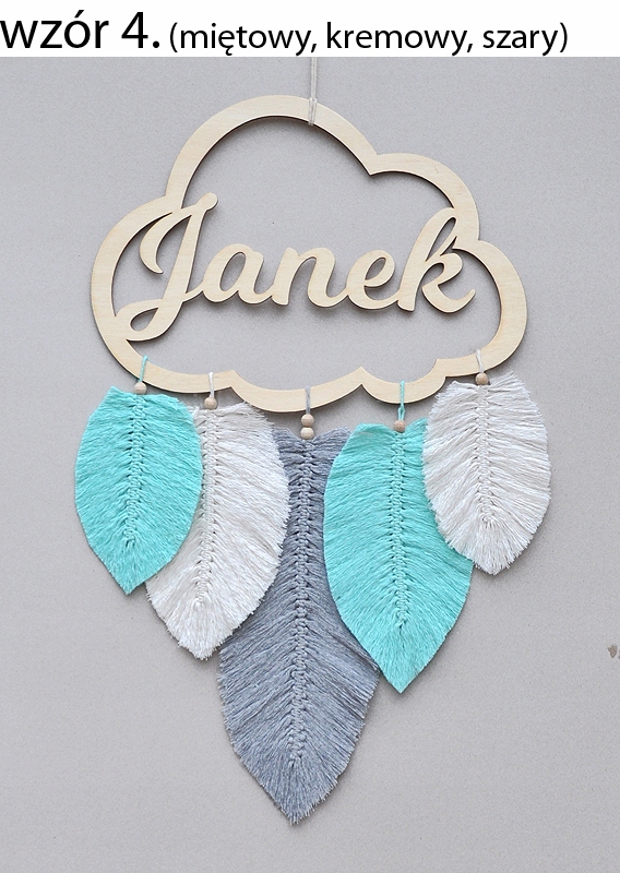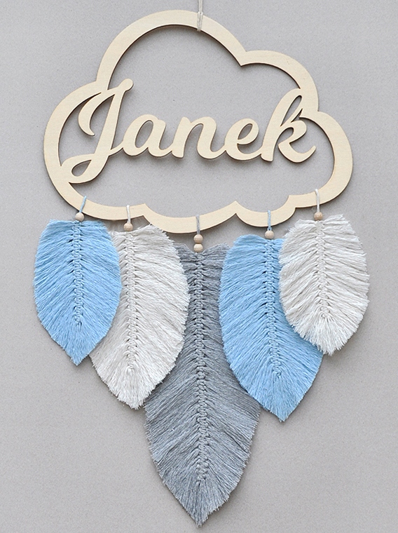 Oferujemy Państwu efektowne "łapacze snów" - makramy z imieniem. Dekoracja składa się z drewnianej obręczy (chmurki) z imieniem oraz kolorowych, makramowych liści, wykonanych z bawełnianego sznurka. Makramy wykonujemy w wielu wersjach kolorystycznych, łatwo więc będzie Państwu dobrać kolorystkę najbardziej pasującą do wnętrza i własnego gustu. Liście w makramie są wykonane starannie, są gęste, zrobione z bardzo dużej ilości sznureczków. Razem z drewnianą obręczą z imieniem dekoracja wygląda naprawdę przepięknie.