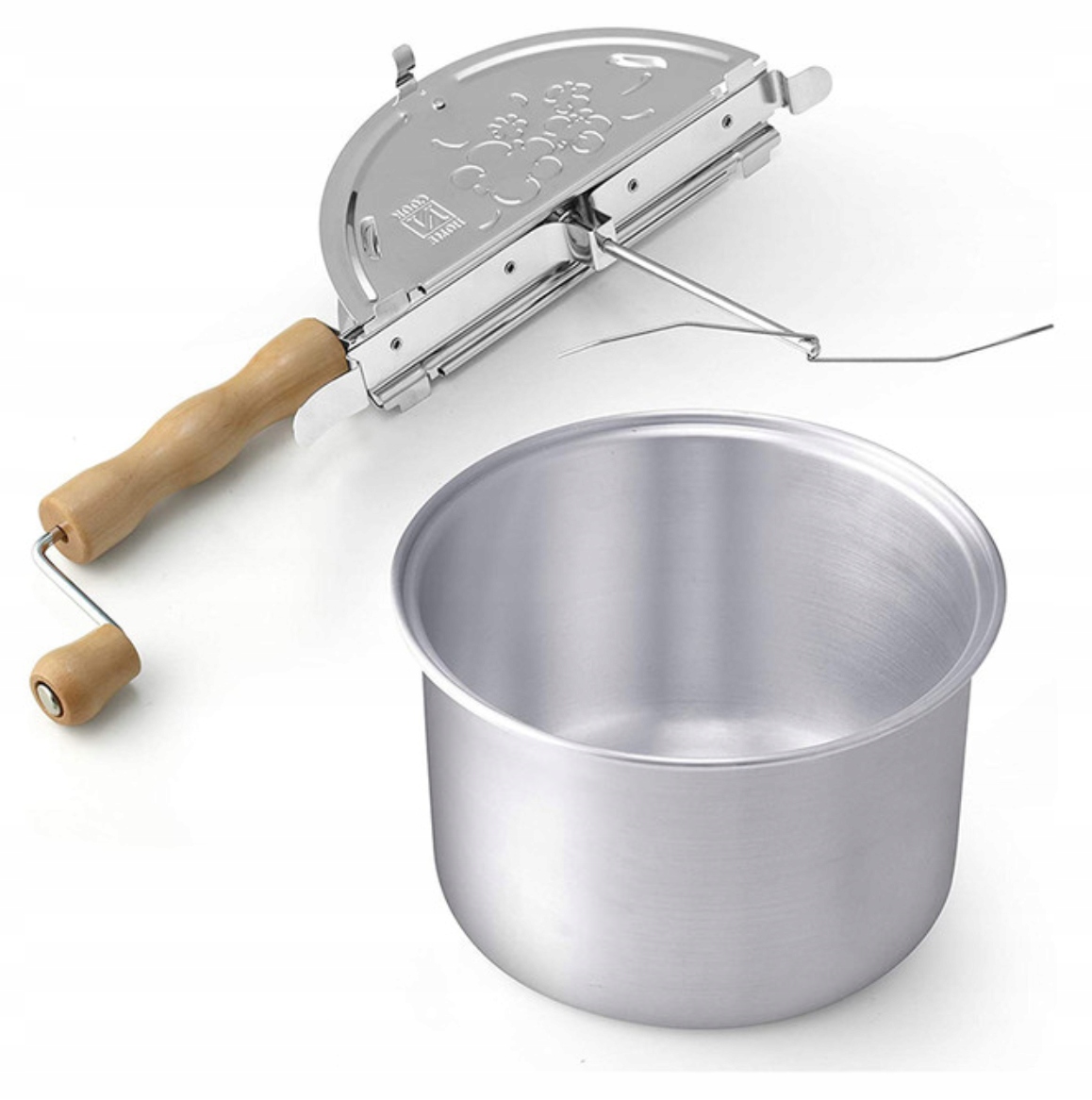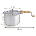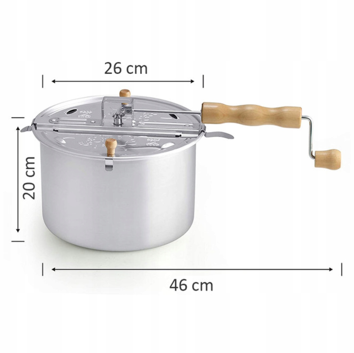 Высококачественный алюминиевый горшок для производства попкорна в условиях домашнее хозяйство, которое не нужно подключать к сети. Вы можете приготовить традиционный попкорн (соленый и сладкий) в стиле кино высокого качества на плите (электрическая, газовая или керамическая плита-не подходит индукционная плита) дома и создать домашний кинотеатр для всей семьи и наслаждаться вместе. Горшок можно легко перемещать, и вы без проблем приготовите свое любимое лакомство на мероприятия на свежем воздухе, барбекю или экскурсии на природе. Устройство литров готового попкорна, и это приличная доза закусок, которые можно приготовить всего за один раз около 3 минут. Преимуществом этого котла является как простота эксплуатации, так и последующая очистка и хранение. Его жесткая высококачественная деревянная ручка предотвращает ожоги и позволяет вращение внутренней мешалки, так что попкорн не пригорает и чувствует себя хорошо смешано. Два отверстия сверху позволяют пару и влаге выходить, так что получаемый попкорн это более высокое качество. Этот горшок также подходит для курения других продуктов, таких как: для обжаривание кофейных зерен, миндаля, арахиса, кешью ...